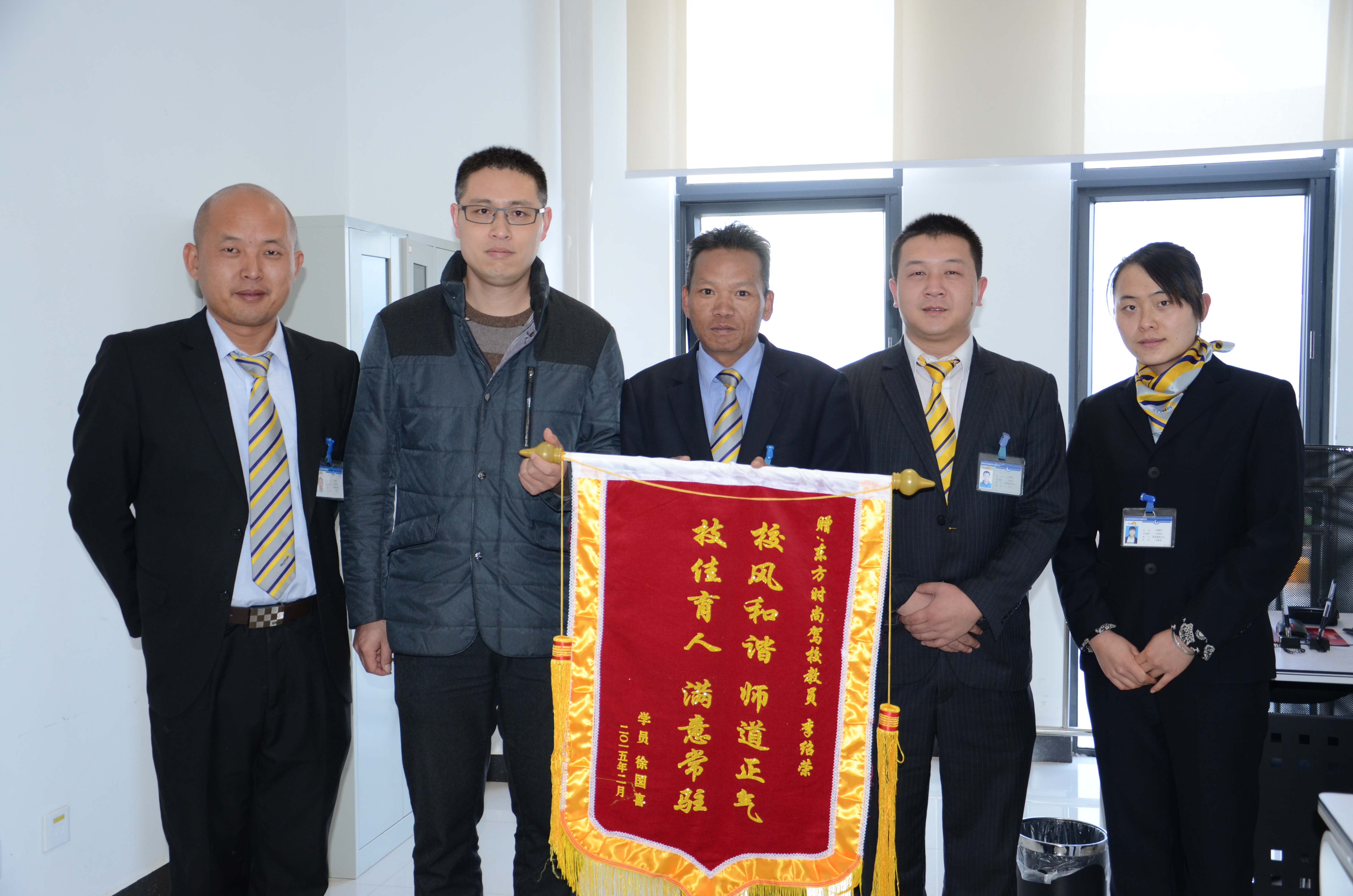 2015年2月16日上午,昆明东方时尚驾校学员徐国喜来到驾校贵宾服务中心,向教练员李绍荣送来 “校风和谐、师道正气,技佳育人,满意常驻”锦旗一副,对其提供优质热情服务和工作高效率表示深深的感谢。