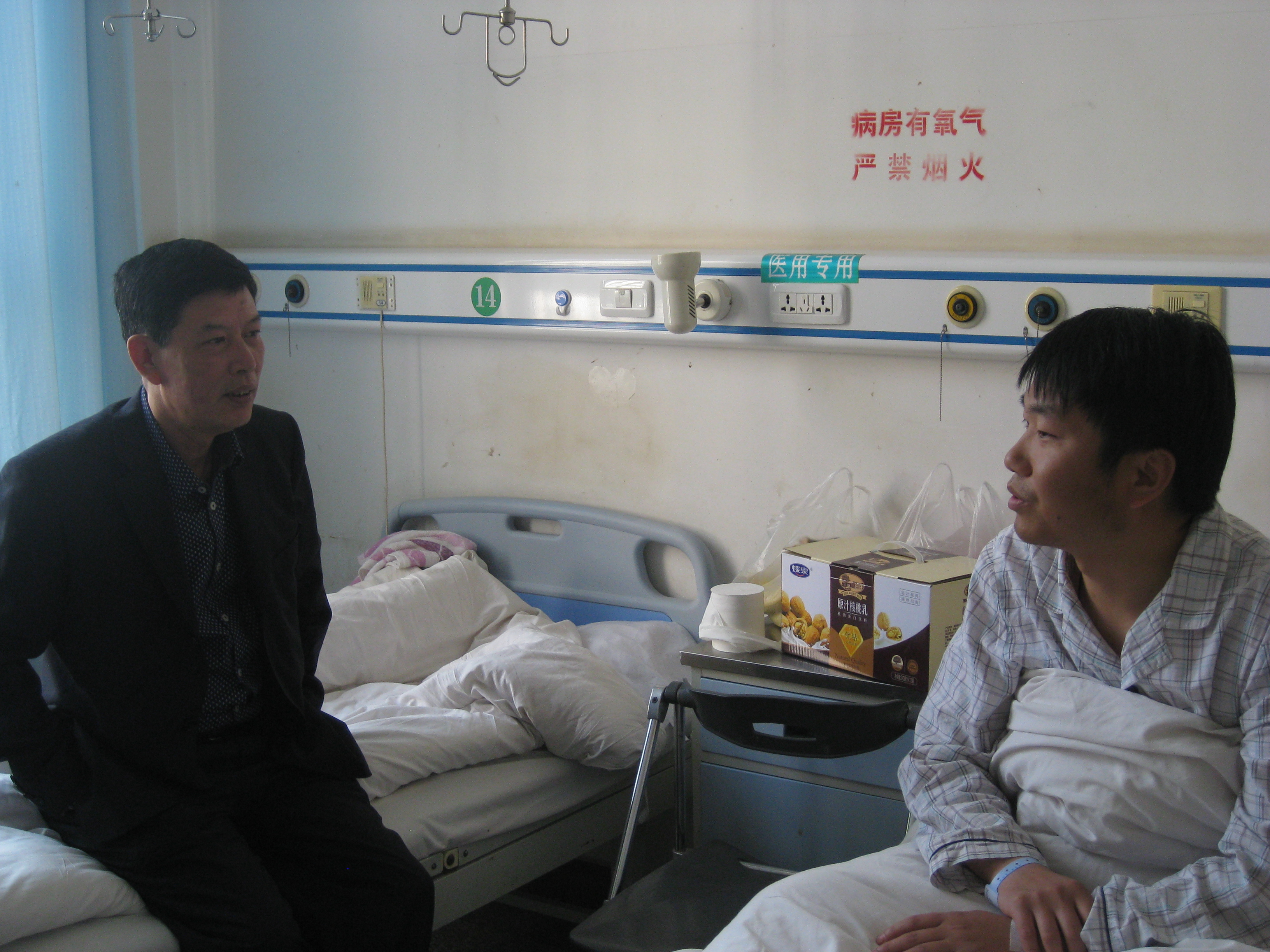 2014年3月7日,昆明东方时尚常务副总在教务处主任马跃、主管杨君的陪同到嵩明县人民医院看望了我公司教务处员工揭少魏老师,公司领导陈总关切的询问其目前的治疗情况,并嘱咐他术后安心养病,积极配合医院进行治疗,争取早日康复出院。