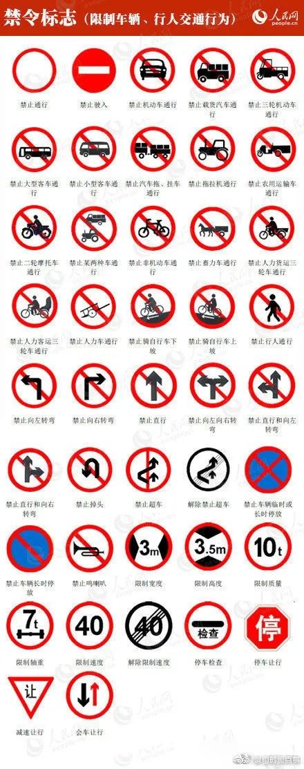 交通标志,用文字或符号传递引导、限制、警告或指示信息的道路设施。又称道路标志、道路交通标志。在交通标志中一般是以安全、设置醒目、清晰、明亮的交通标志是实施交通管理,保证道路交通安全、顺畅的重要措施。交通标志有多种类型,可用各种方式区分为:主要标志和辅助标志;可动式标志和固定式标志;照明标志、发光标志和反光标志;以及反映行车环境变化的可变信息标志。 ——百度百科 警告标志 颜色为黄底、黑边、黑图案, 形状为等边三角形,顶角朝上。 图片来源:人民网 禁令标志 颜色为白底、红圈、红杠、黑图案,图案压杠。 其中解除禁超车、解除限制速度标志为 白底、黑圈、黑杠、黑图案,图案压杠。 形状为圆形,让路标志顶角向下的等边三角形。 图片来源:人民网 指示标志 颜色为蓝底、白图案。 形状为圆形、长方形和正方形。 图片来源:人民网 指路标志 颜色除里程碑、百米桩、公路界牌外, 一般道路为蓝底、白图案。 形状除地点识别标志外,均为长方形和正方形。 图片来源:人民网 除了上述的基础交通标志, 还有一些交通知识 也是我们必须要掌握的。 图片来源:人民网 图片来源:人民网 图片来源:人民网 图片来源:人民网 图片来源:人民网 这么多知识点, 你们都记住了吗? 赶快保存、收藏、分享 给您的小伙伴吧! 节假日外出, 遵守道路交通安全标志、标识, 东方时尚祝您一生平安! 报名热线:95799或0871-68629999